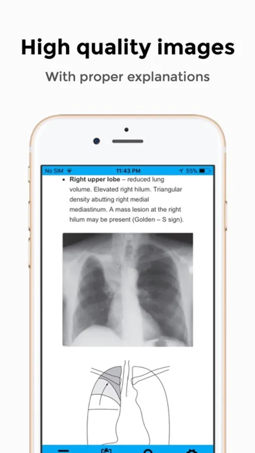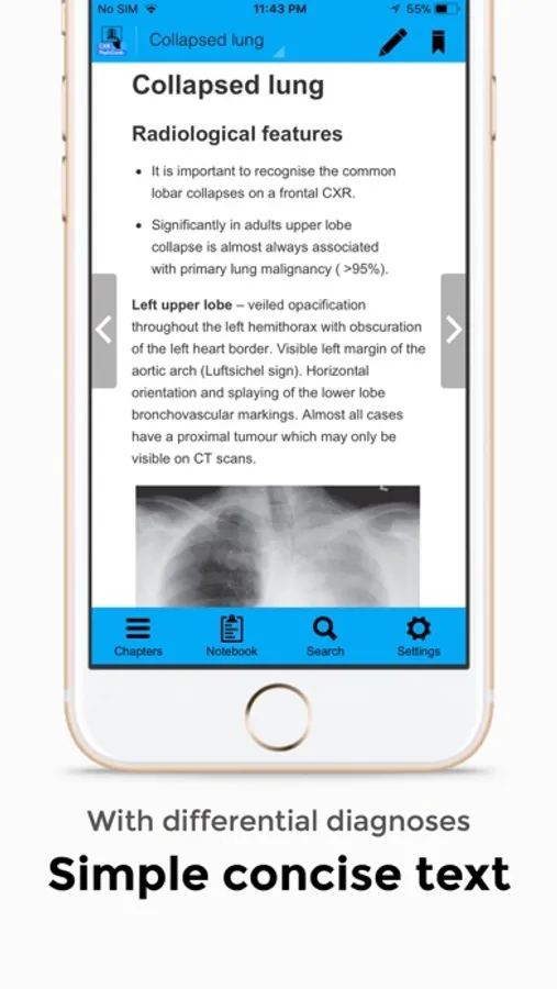 Each condition has its radiological appearance, brief differential diagnosis review followed by high quality X-ray images of that specific disease condition. This app sort of works like an atlas for chest radiographs