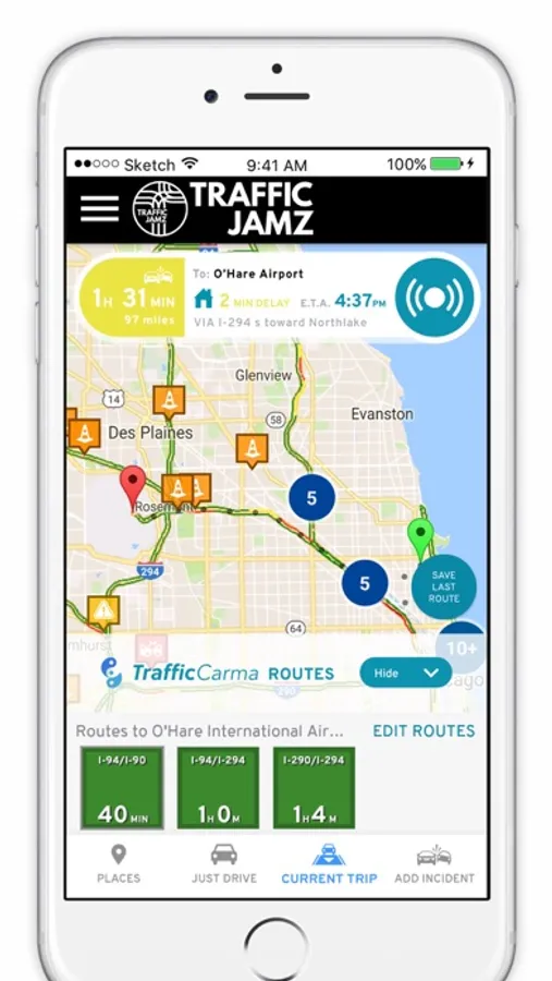 With Traffic Jamz, you can receive all of this information via the map and route segments or you can also listen to custom audio reports for your personalized routes to learn which roadway is best.
