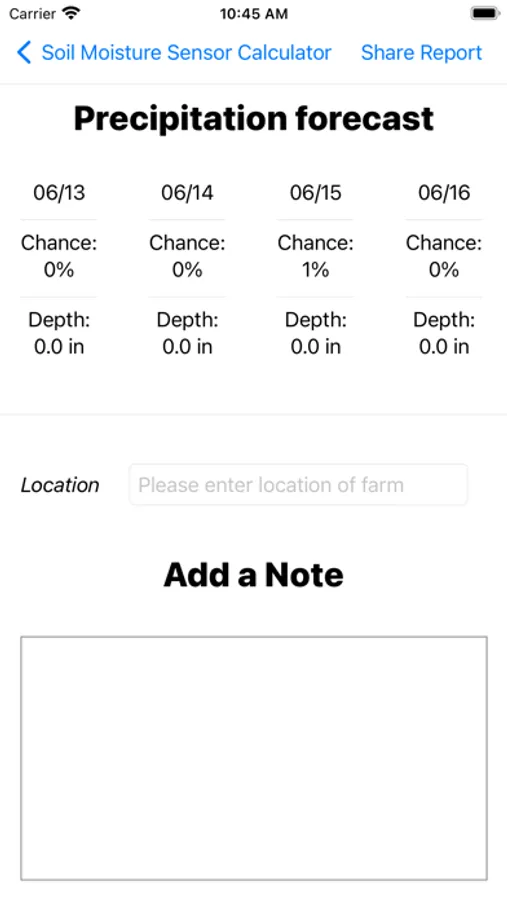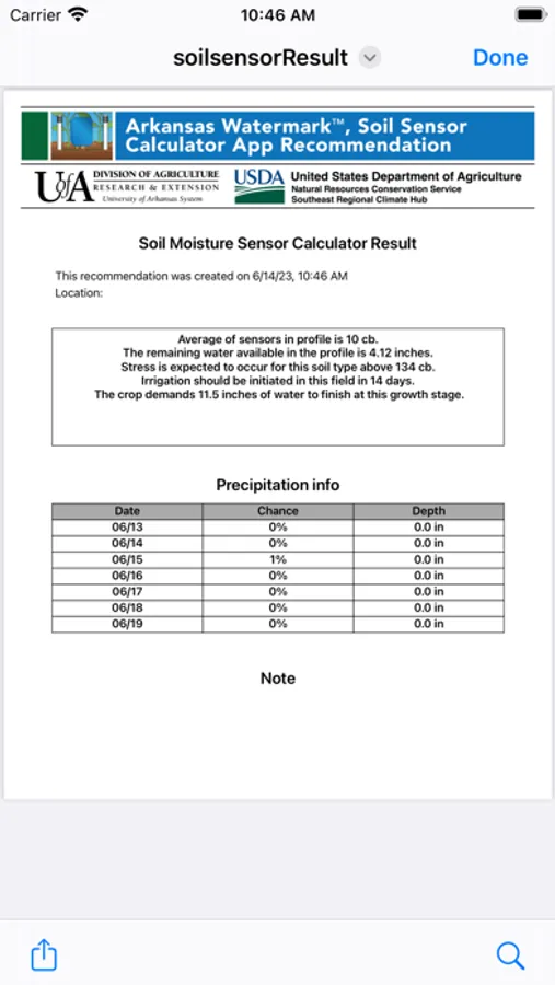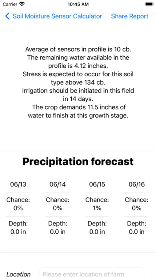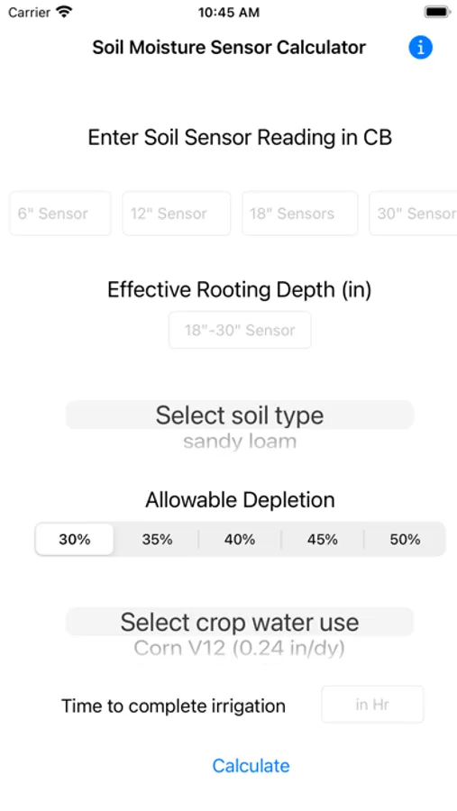 The calculator allows for the user to enter readings from Watermark brand sensors. The user enters the readings for the rooting depth, the effective rooting depth for the stage of growth, the soil type and the Managed Allowable Depletion (MAD). The app calculates the average centibar reading for the provided values, the available water remaining and provides the stress level. Days to required irrigation can then be easily determined. How much water is required for last irrigation is also calculated and adjusted for irrigation efficiency.