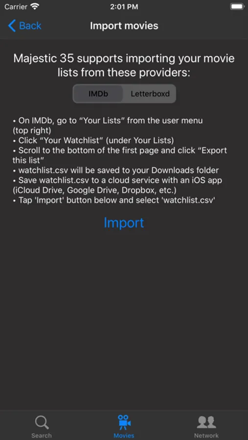 If you're already using another service to catalog your movies, Majestic 35 supports importing from IMDb and Letterboxd.