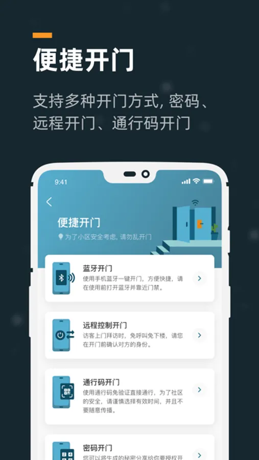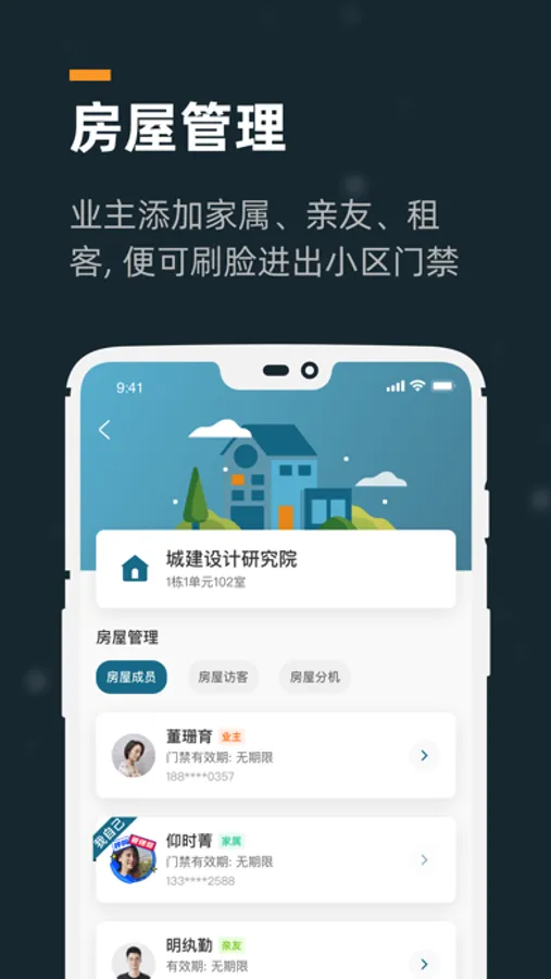 现在,非业主用户使用本产品可以通过可视对讲功能,呼叫业主通行社区,业主用户不仅可以使用可视对讲功能对每一个访客的身份进行确认,还可以对家庭成员、访客、租客的社区通行权限进行在线管理,使用简单方便。