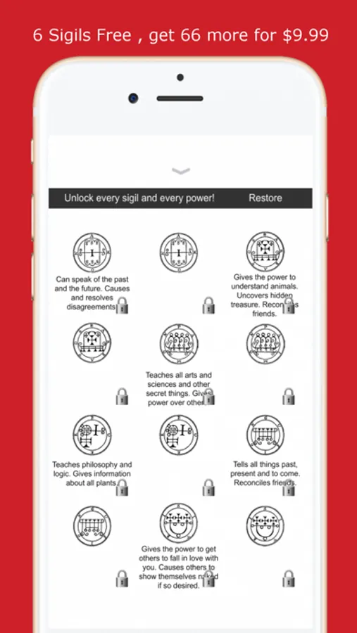 Manifestation Magick contains 6 free sigils and a further 66 sigils that can be unlocked via an in-app purchase. Each sigil is shown twice, once with a brief description of the powers of the entity associated with that sigil, and once with just the sigil shown. The name of the entity can be read in each sigil by taking the uppermost letter as the first letter in the name and then reading clockwise.