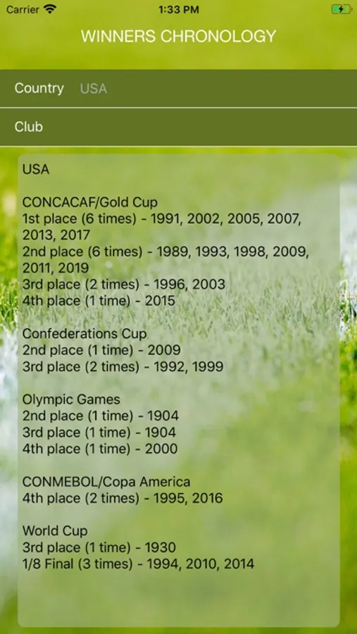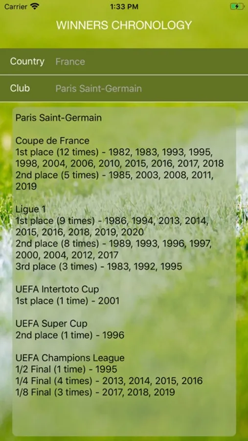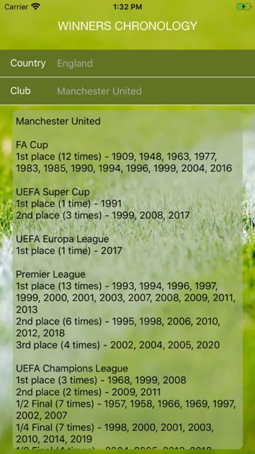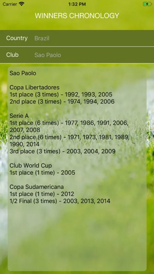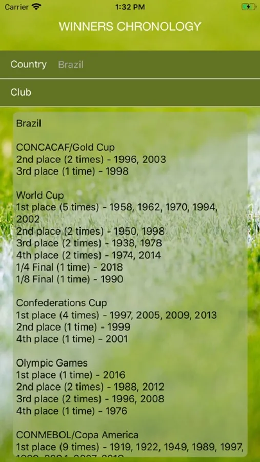 Most simple app with only two keys: “Country” and “Club”, that allows to get achievements' chronology of National teams and clubs of International and National competitions by one touch.