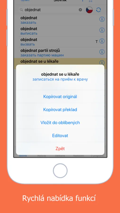 • Slova vložená do Oblíbených lze ze slovníku vyexportovat. Doplněná a neznámá slova si tak můžete vytisknout či snadno přenést do jiného programu.