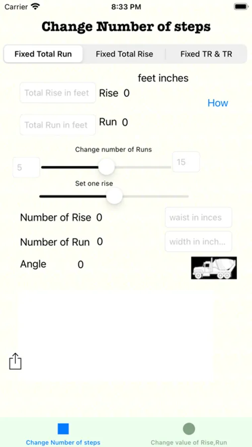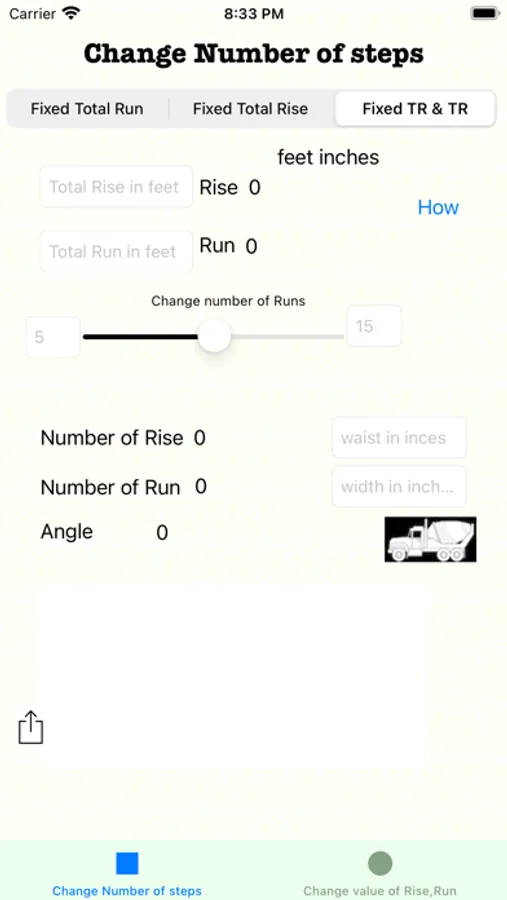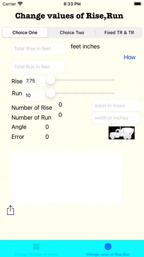 Upside down of Choice One ,When you change rise slider It will calculate number of rise through that ,it will calculate Total rise and It will set Total rise Value. When you change run slider It will calculate number of runs through that ,it will calculate Total run and It will set Total run Value.