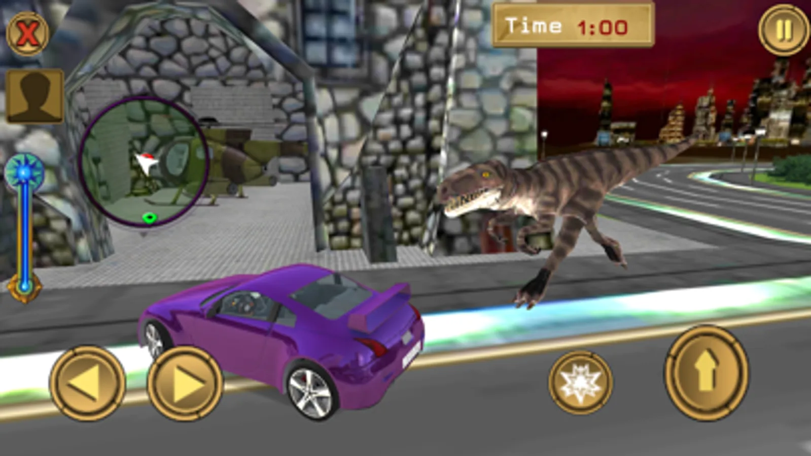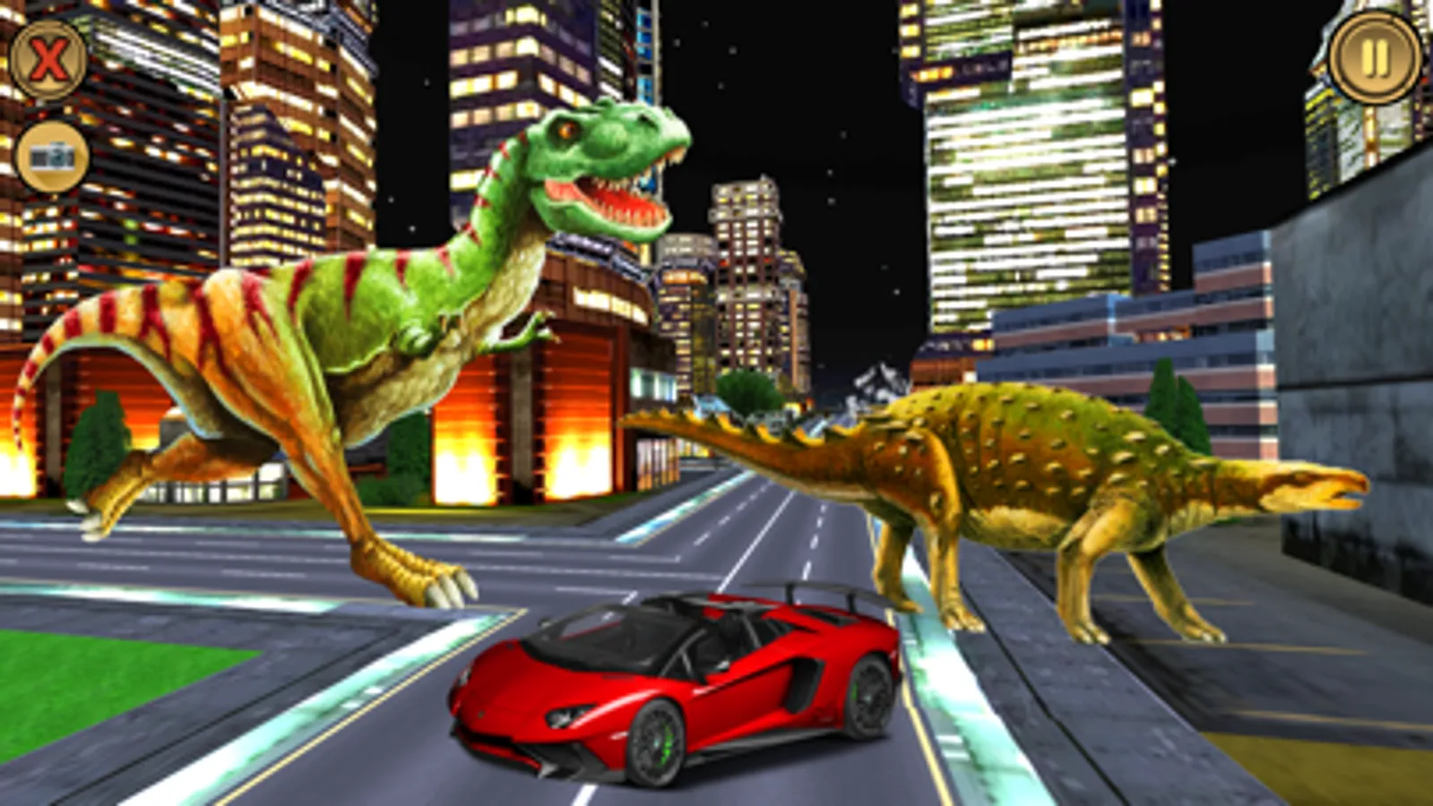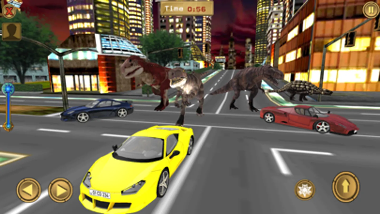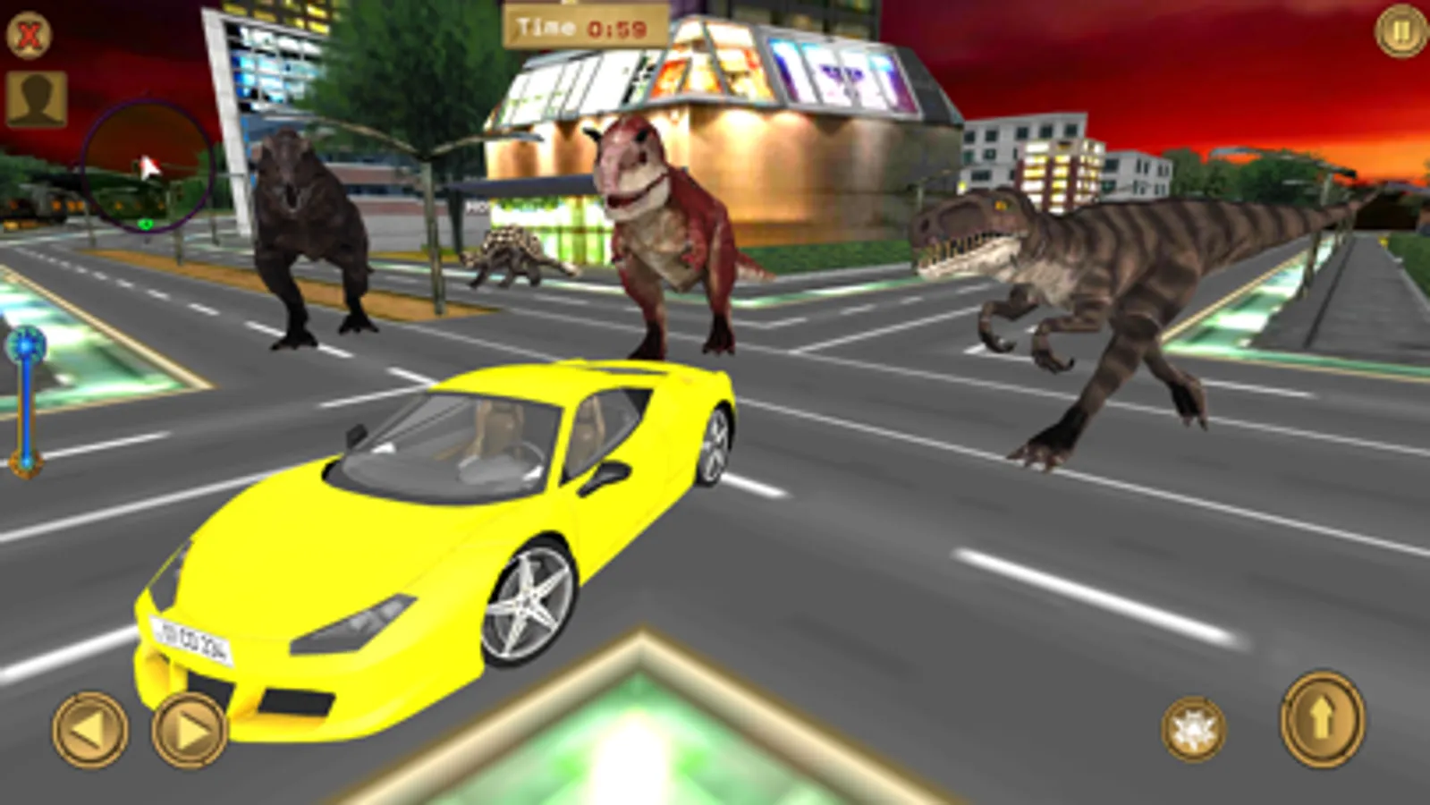 Some days ago, a group of hunters went to the jungle for hunting. That hunter went there to hunt small animals but one of them saw an unexpected thing there. They saw a baby dinosaur in the jungle and they chase them and found a world of rhinos and dinosaurs. They took Jurassic dino eggs along them to the city. This made the elder dinosaur of the dino world and their friend's rhino very angry. They chased hunters and entered the city. Dinosaurs were very disturbed and got mad. When hunters saw them in a horrible state coming towards the city, they decided to return the egg to the jungle. One hunter gathered courage and rushed towards Jurassic dinosaurs to return the dino egg so, that they can get back to their world. But Jurassic dinosaurs and their friend's rhino were very angry and they did not see that hunter was coming to return their egg. Instead, they killed that hunter and broke their egg. When other hunters saw this situation they started their cars and started to reach the city as soon as possible. Angry dino chases them and in this way, they left Diana's world and reached the city. Hunter hid in the same place but due to their mistake, many dinosaurs entered the city. Now angry Jurassic dinasour and their friend's rhino are spread all around the city and they chase all cars in the city. Your mission is to escape from the angry dinosaur and rhino and park your car at a safe place in the city.