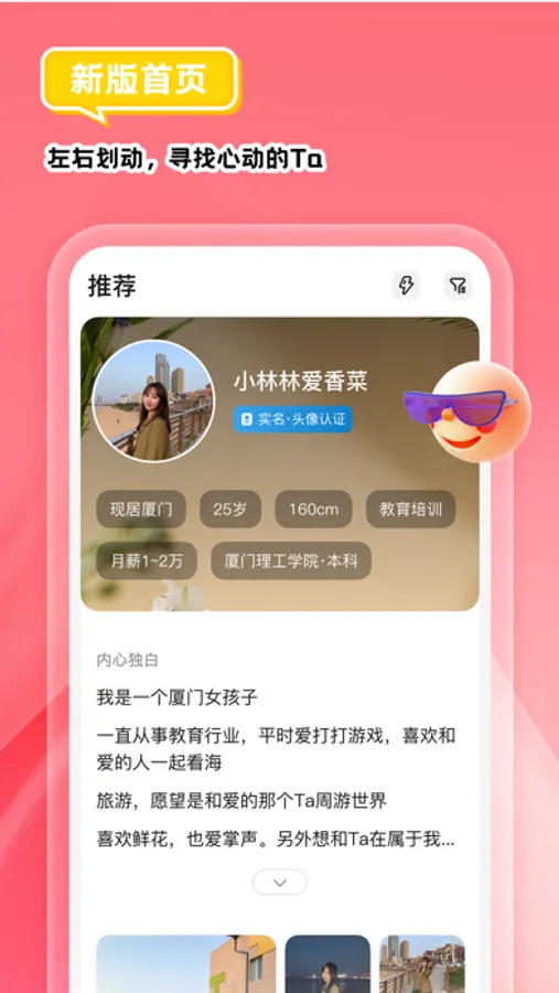 -真诚恋爱:接入更多认证机制,通过人脸识别、身份证核验、学历授权、工作认证提升资料的可信度。