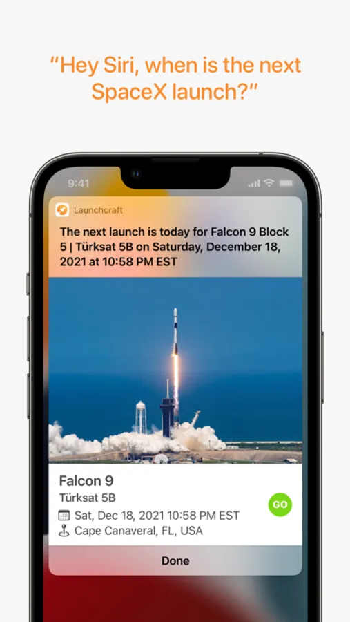 • Siri Shortcuts: Use Siri to get the next launch for any launch provider. For example, “When’s the next SpaceX launch?”