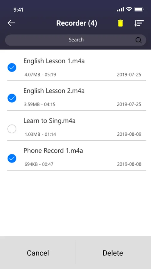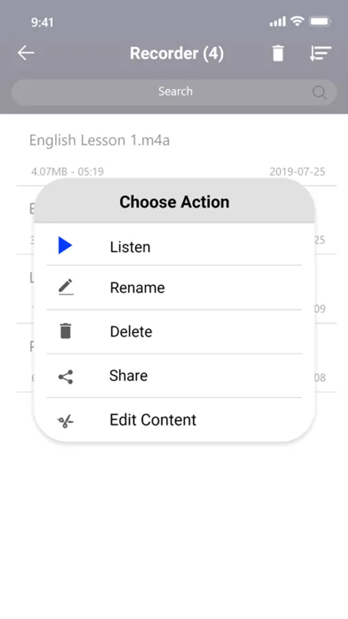 - have delete function, share function (via email, sms, mms, facebook, whatsapp, dropbox, etc.), view detail information