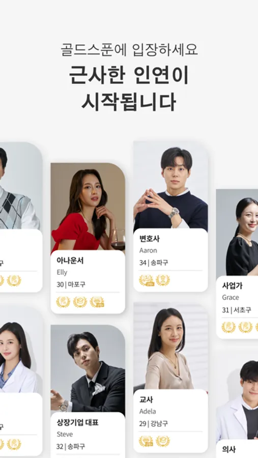 의사, 변호사 등 전문직 종사자, 연 매출 50억 이상의 사업가, 기업가치 5000억 대의 IT기업 창업자 등 각자의 영역에서 성공을 일궈낸 남녀 회원님들과 명문대를 졸업한 현직 장관/차관의 자제분 등 골드스푼의 엄격한 심사를 통과한 남녀 회원들이 모인 하이엔드 커뮤니티로 자리 잡았습니다.