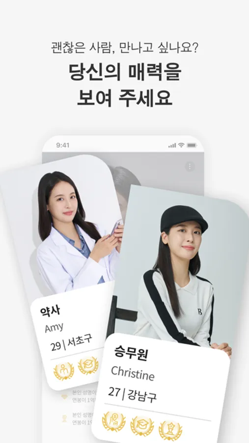 14만 명의 엄선된 엘리트 회원들이 까다로운 심사를 통과해 가입되어 있으며 100% 회원제로 운영되고 있습니다. '인증, 경제력, 바른 만남’ 세 가지의 원칙을 가지고 2018년 4월 처음 탄생한 이후 줄곧 30% 이하의 회원 합격률을 유지하며 엄격한 심사를 통해 엄선된 회원님들이 모여있습니다.
