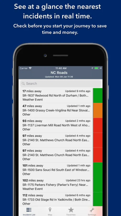 - Shows current incidents in order of distance from your current location (closest incidents are shown first).
