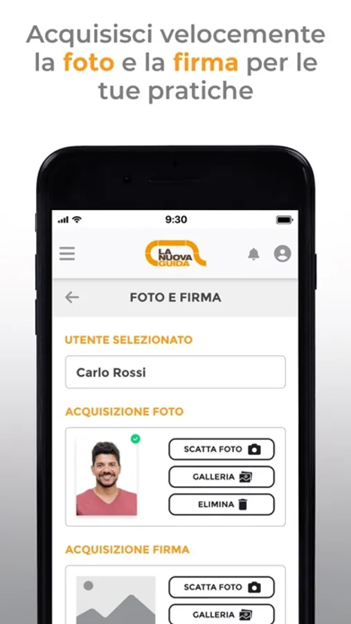 Scatti la foto e raccogli la firma del tuo cliente. L'App ti consente di effettuare l'ottimizzazione ICAO della foto e di associarla direttamente alla anagrafica del cliente.