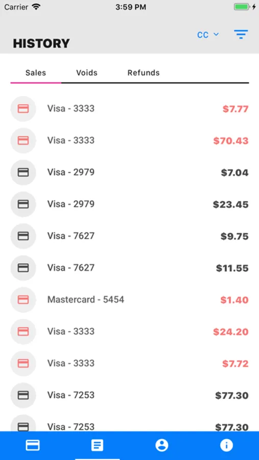 You can track all sales activities within the app: approved transactions, declined, reasons for the declined, and historical transaction activity and quickly enabled you to refund or void transactions.