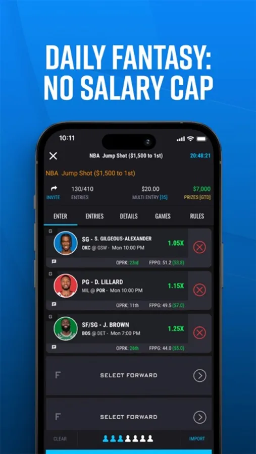 • Create over/under entires of your favorite players with the highest payout structure in the industry