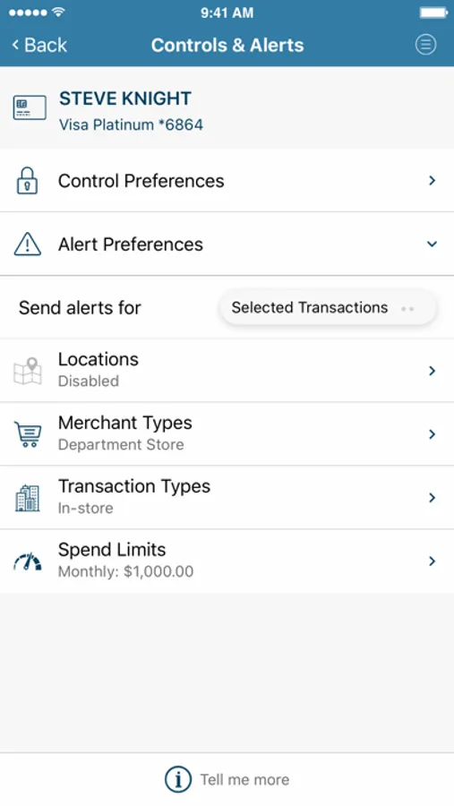 • Stay in control with real-time alerts and controls. Lock your card, set spending limits and determine where your card can be used.