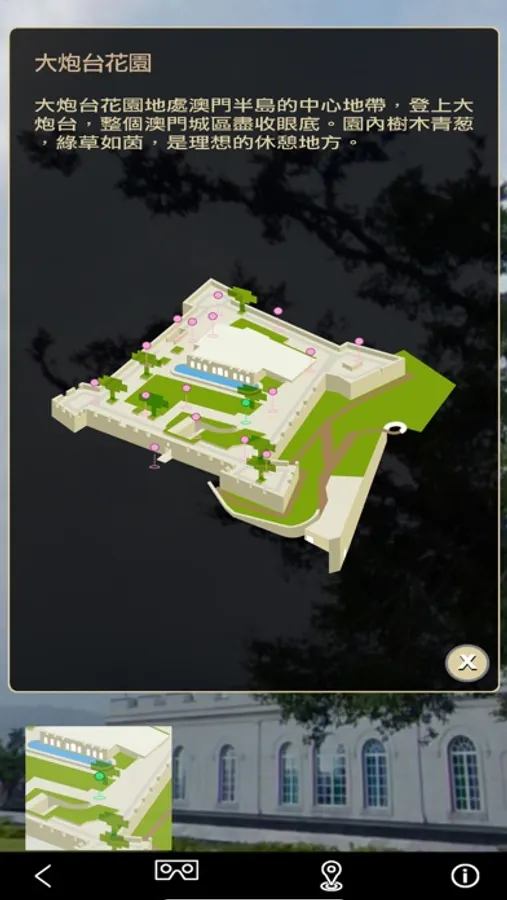 1. VR (Virtual Reality): Presents the interior of the three-floor museum and the fortress garden in 720-degree panoramic environment. Viewers can explore every corners of the building while enjoying the beautiful scenery of the fortress garden. (better viewed with VR eyeglasses)