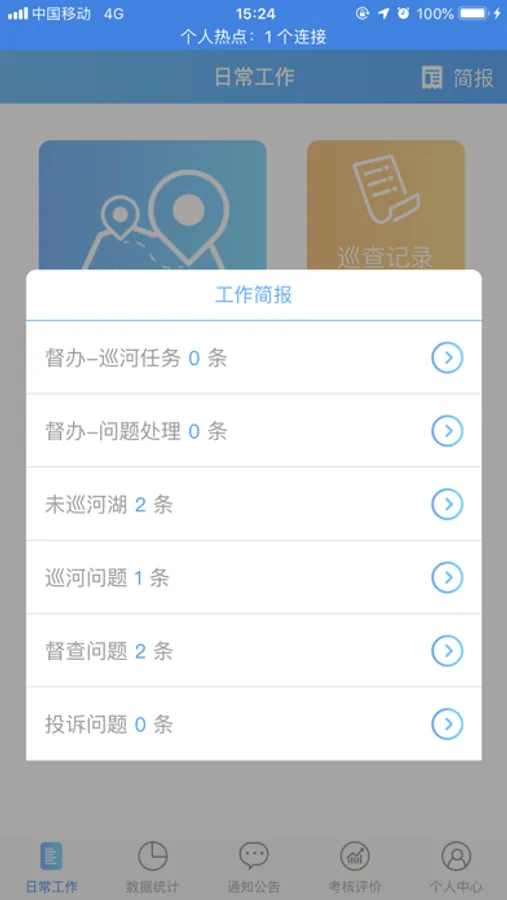 日常工作分为河长巡河、巡河记录、河道资料、督导处理、工作事项。河长巡河为河长日常巡河使用,在巡河中上报问题,结束巡河上传巡河轨迹信息。巡河记录提供用户查看自己的巡河历史记录以及管理辖区下的巡河记录。河道资料方便用于随时随地查看河道百科信息,包括河道基础信息、一河一策、公示牌、排污口、水质信息随时掌握。督导处理为相关检查机构以及高级河长提供检查督查机制,检查下级河道以及辖区河道的问题。工作事项集中用户需要处理的问题,包括巡河自查问题、督查问题以及投诉问题,用户可以在这里处理与自己相关的问题;