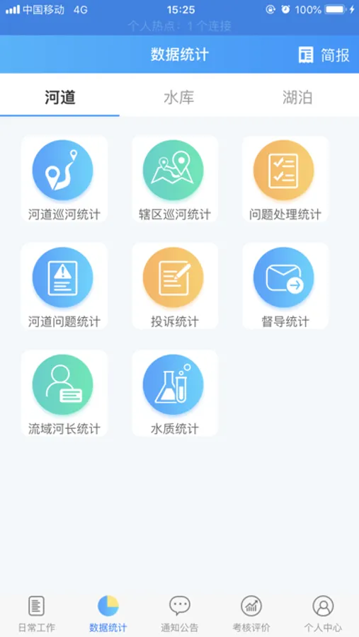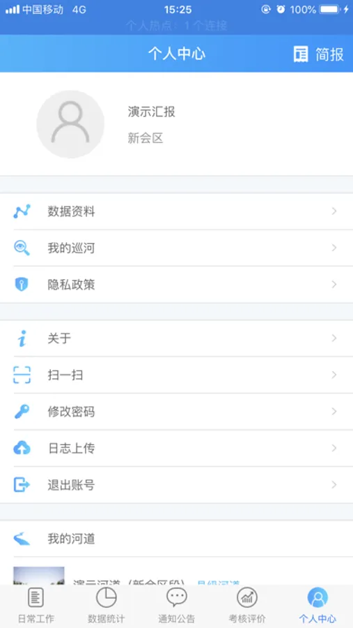 一款针对河长制用户定制的巡河软件;主要功能分为:日常工作、数据统计、信息交流、考核评价、个人中心;
