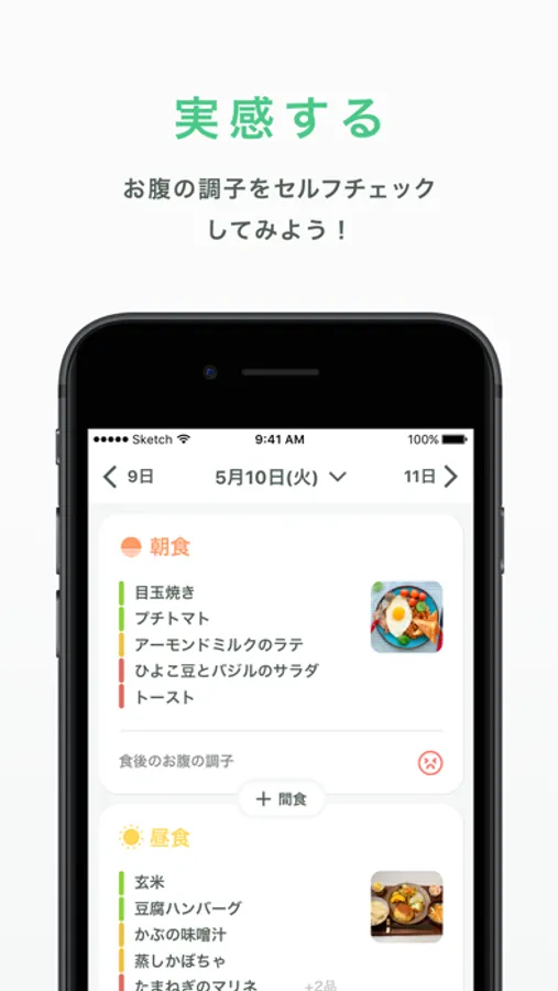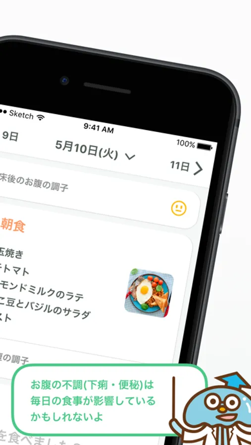 ・食事、間食、排便、お腹の調子、メモを毎日記録できます