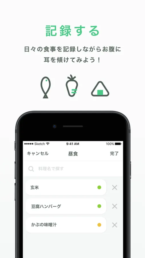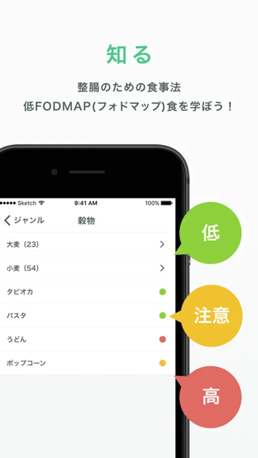 ・記録する食材には「高FODMAP食材」「低FODMAP食材」「食べる量に注意が必要な食材」の情報があります