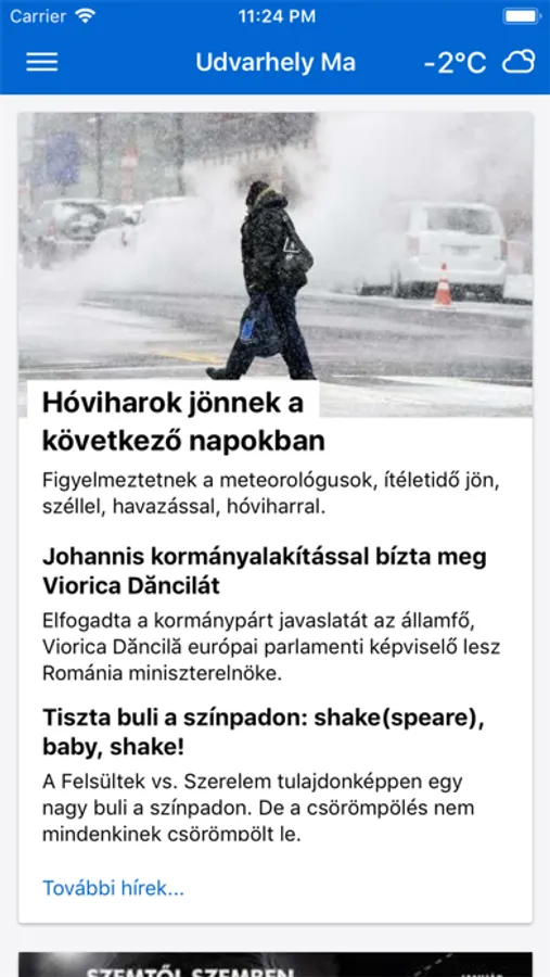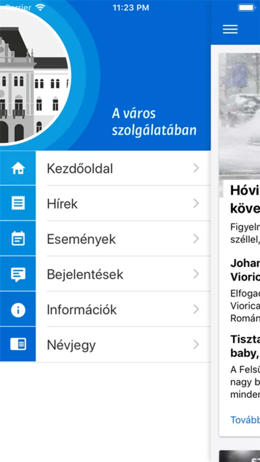 - Hírek: folyamatosan frissülő információk a városban történt eseményekről;
