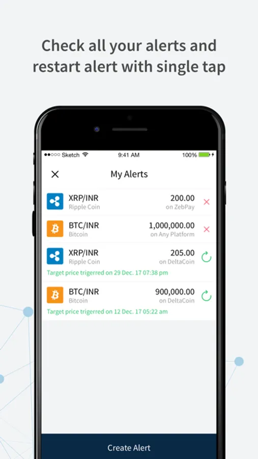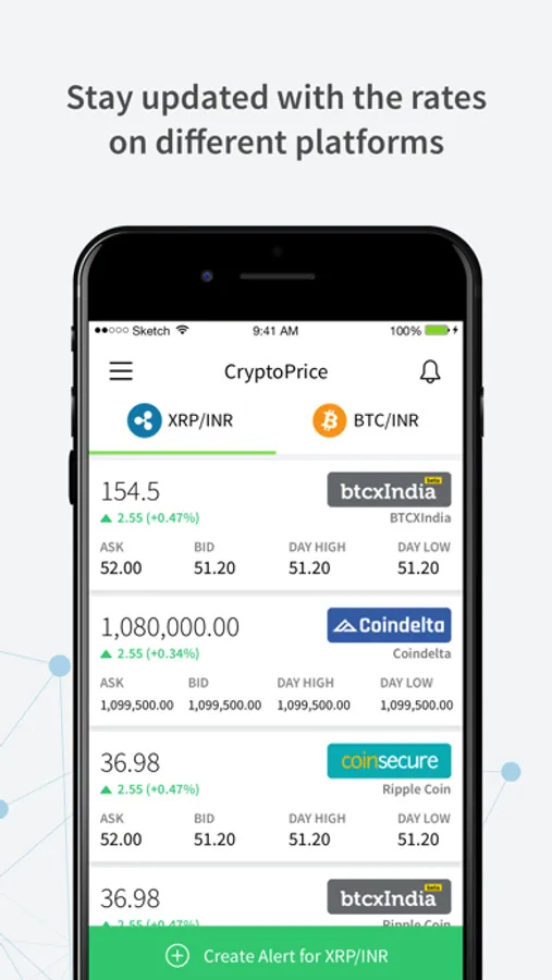 CryptoPriceAlerts simplfies the work of comparing the prices from different platforms by bringing all your data on a single screen and help you trade at right time by notifying you of any significant price movement via the Price Alert notification feature.