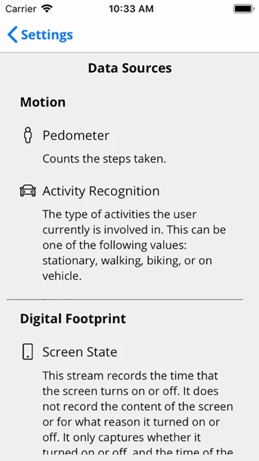 This app provides you with full control over the data you provide to the study and all participation is optional. You can pause the app operation at any time to stop passive data collection or to skip particular surveys. You can access and review the data collected from your device through your online account. Also, at any time, you can choose to delete part or all of the data you have provided for the study or drop out of the study.