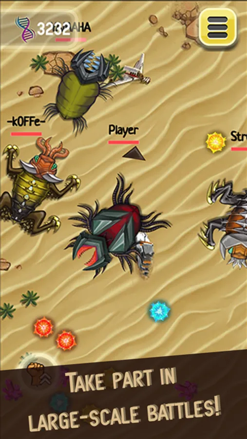 The tactics available for players vary tremendously! Depending on the monster’s evolution stage it can become a tiny weak but very fast monster or, in contrast become a furious, mighty and dangerous monster easily devouring other inhabitants of this tiny universe, showing its power in clashes. It is completely your decision on which skins and parameters to spend the DNA collected in the battles and which evolution path to choose.
