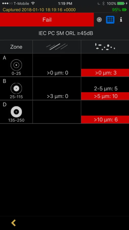 With the FOCIS WiFi2 App, users can perform automatic analysis of fiber optic connector integrity to IEC 61300-3-35 (2015), IPC 8497-1, ATT-TP-76450 or user-defined standards to document the presence or absence of dirt, oil, particles, scratches and pits/chips. Results can be stored locally or shared using email, text and mobile cloud-based services such as DropBox.