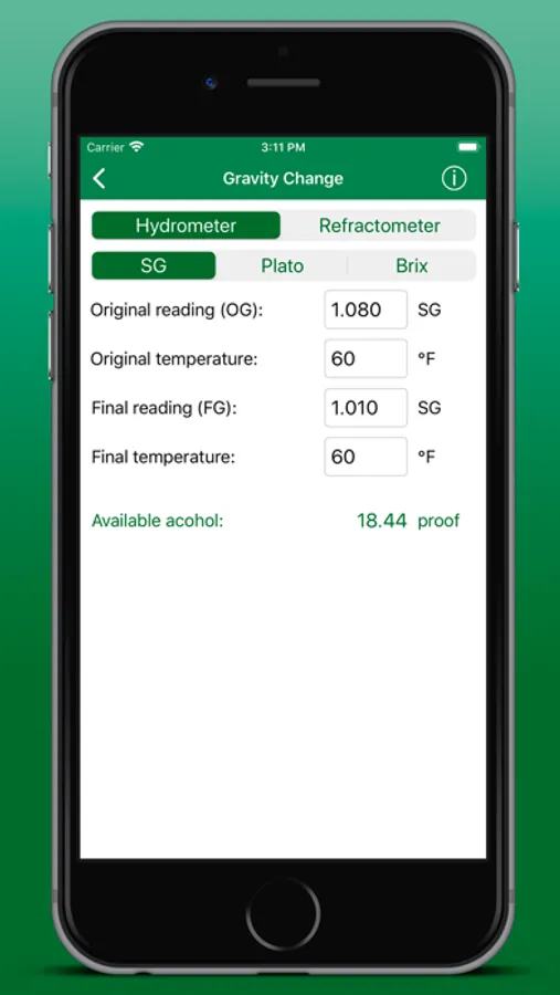• Gravity Change – calculating alcohol per volume, based on gravity change in SG, Plato and Brix