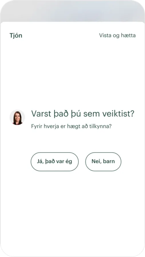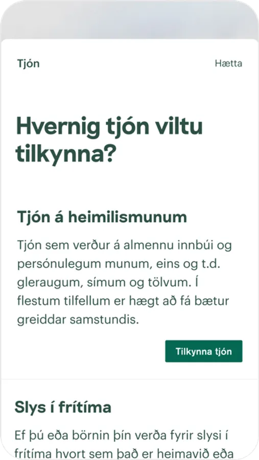 * Tilkynna tjón til TM þegar fjölskyldumeðlimur hefur orðið fyrir slysi innanlands í frítíma sínum.