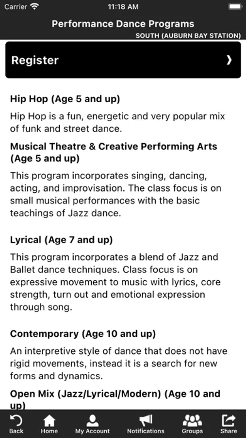 Pre-school, 5 year combo, Ballet, Tap, Jazz, Hip Hop, Creative Performing Arts, Acro, Lyrical, Contemporary, Stretch & Strength, Demi Pointe, Pointe and Modern.
