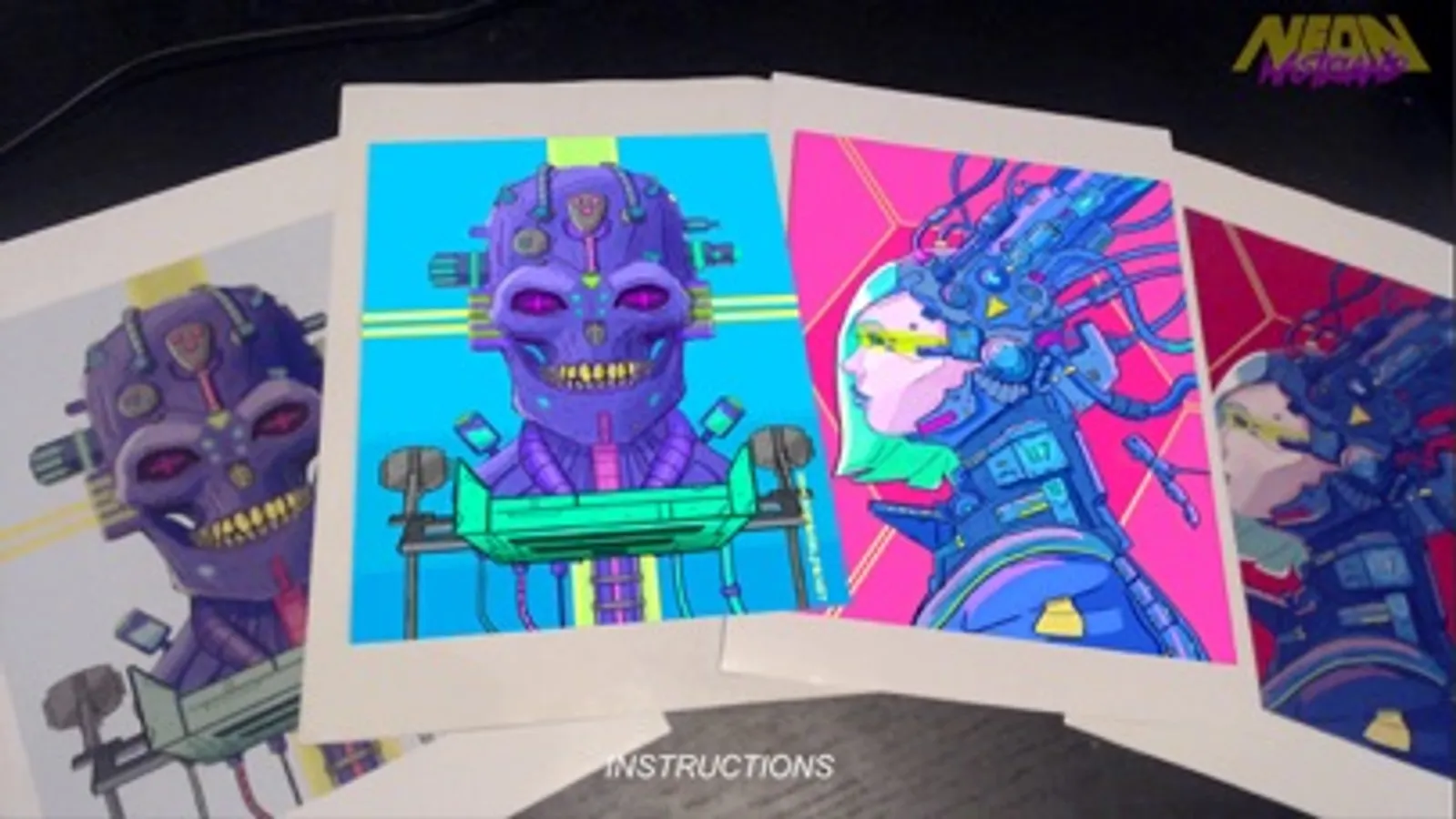 The Neon Wasteland AR app uses augmented reality to bring the art of Neon Wasteland to life. Simply point your phone or tablet's camera at any supported image and watch it display vibrant colors or change to a full motion animation! Free image markers are available at www.RobShields.net/art. Subscribe to the newsletter on the official website to receive updates on this project.