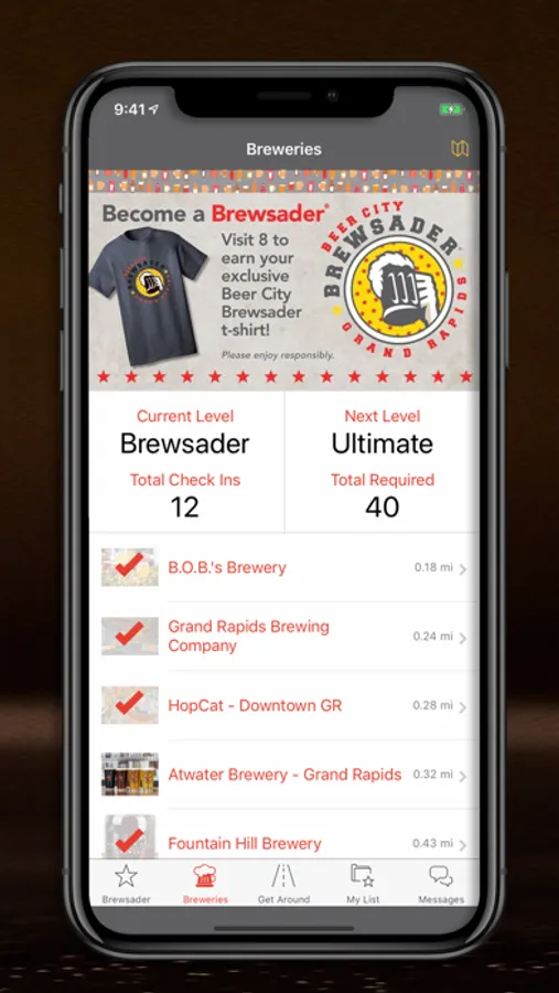 • Check in to 8 breweries to receive a free Brewsader T-shirt