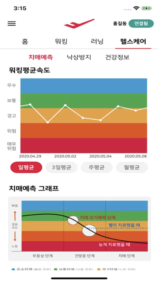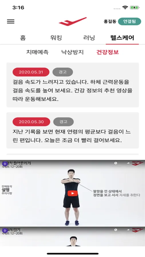 ‘건강정보’ 탭에서 일상생활의 워킹 분석을 통해 스스로 건강관리를 할 수 있도록 나의 워킹 건강 상태에 대한 알림 메시지를 매일 제공합니다. 나의 워킹 건강 상태에 맞춘 운동들을 동영상으로 볼 수 있습니다. 간단한 동작들로 혼자 따라 할 수 있도록 구성되어 있습니다.