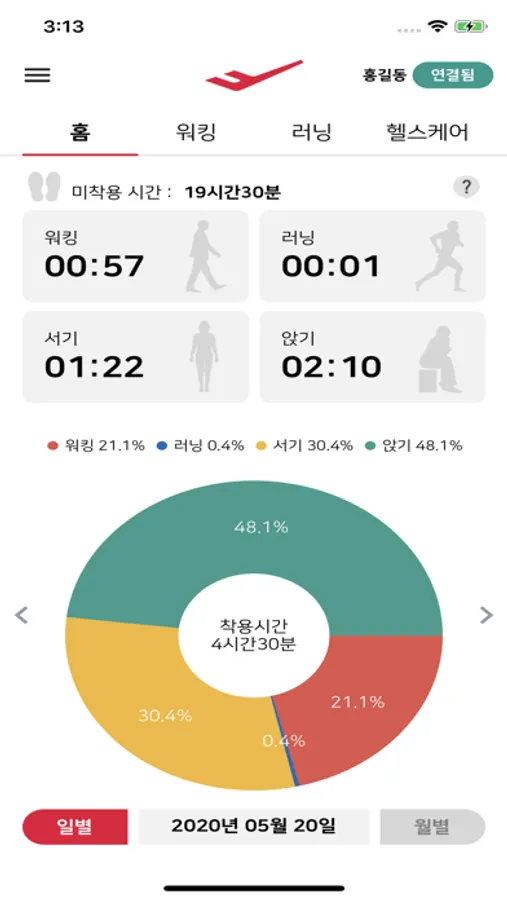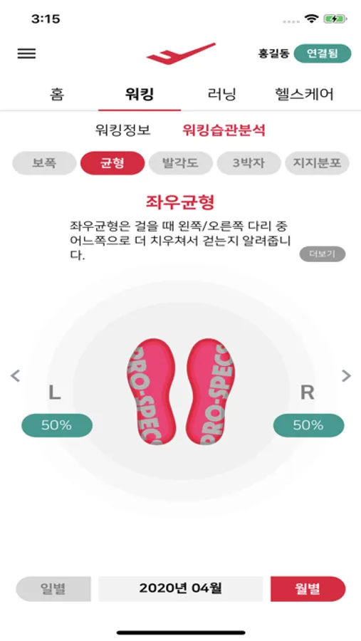 ‘홈’ 탭에서 프로스펙스 스마트인솔을 착용하고 있는 동안의 동작 형태별 활동량을 분석하여 알려줍니다. 워킹, 러닝, 서기, 앉기 등 나의 활동 패턴을 일별, 월별로 알 수 있습니다.