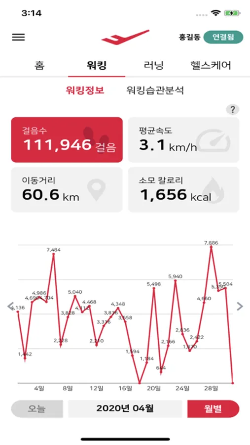 ‘워킹’ 탭에서 걸음 수, 보폭, 좌우균형, 발각도 등의 내가 얼마나 어떻게 걸었는지 확인할 수 있습니다. 나의 워킹 정보를 아는 것은 건강한 워킹 습관 형성의 첫걸음입니다.