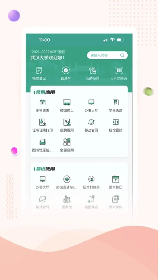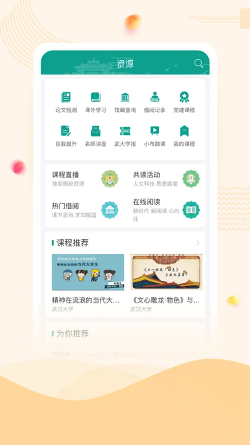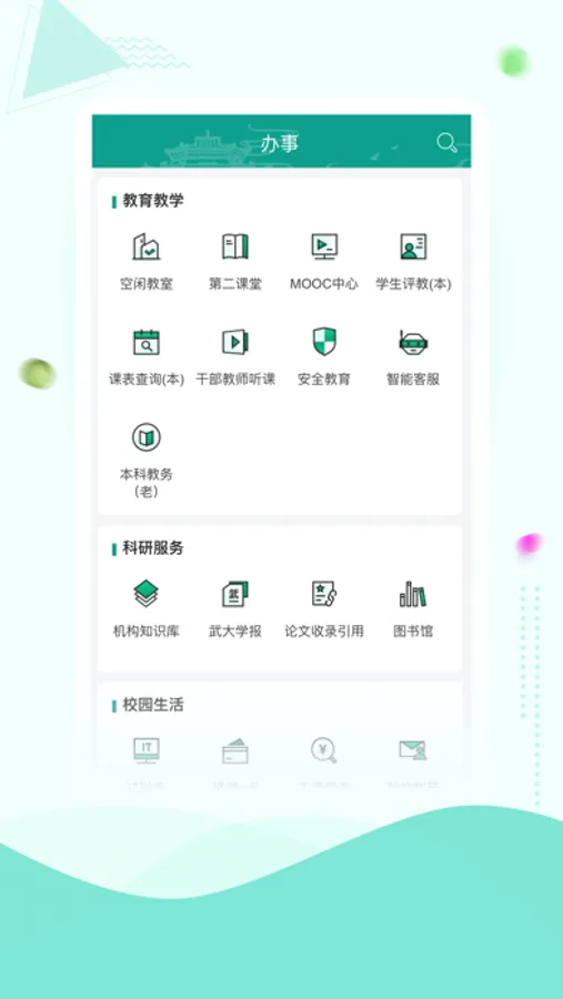 “智慧珞珈”APP中集合“教学科研、管理服务、公共资源”三大板块,包含40多个应用,同时还汇集了图书、期刊、论文、专利及教学视频等优质学习资源。