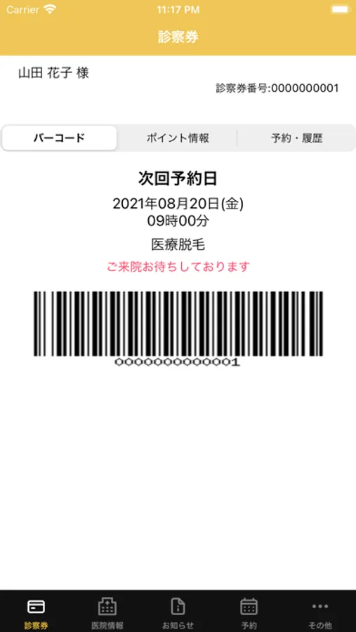 バーコードで受付チェックイン、ご予約日時表示などカードレスな診察券としてご活用頂けます。