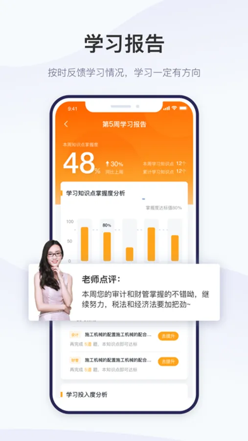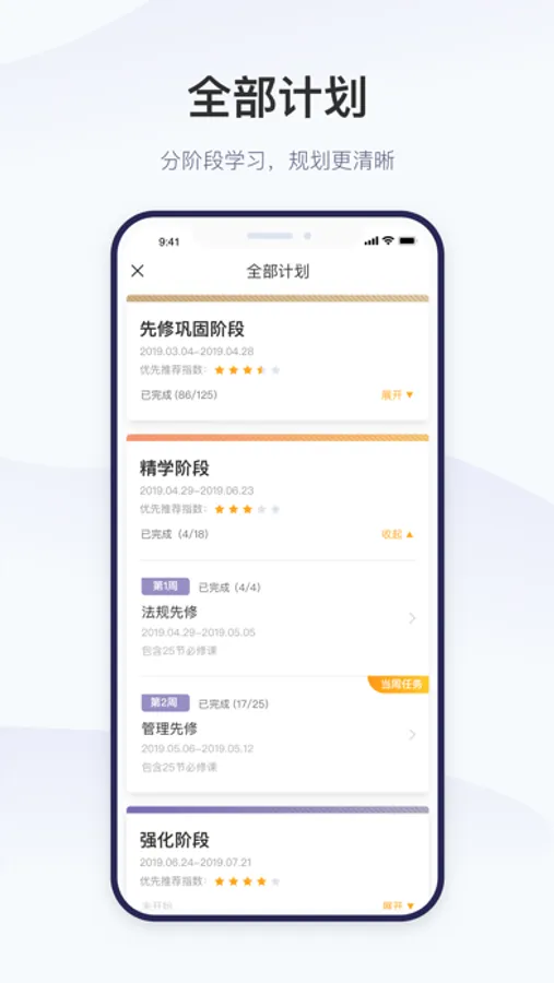 2. 量身定制的学习计划:根据自身情况量身定制专属于你的学习计划,将学习计划以任务的形式呈现,帮你充分利用碎片化时间,分分钟提高你的学习效率。祝你高效拿下考试。