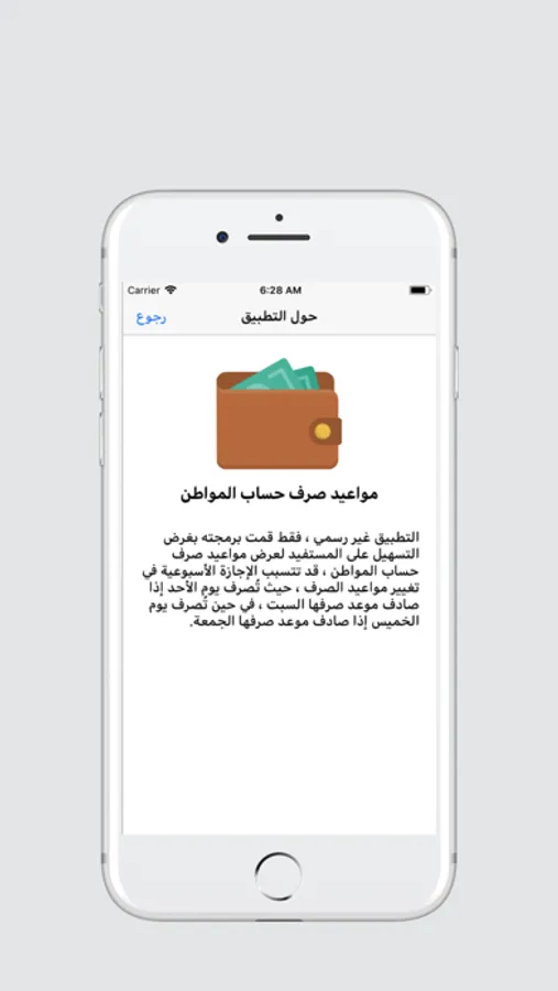 التطبيق غير رسمي ، فقط قمت برمجته بغرض التسهيل على المستفيد لعرض مواعيد صرف حساب المواطن ، قد تتسبب الإجازة الأسبوعية في تغيير مواعيد الصرف ، حيث تُصرف يوم الأحد إذا صادف موعد صرفها السبت ، في حين تُصرف يوم الخميس إذا صادف موعد صرفها الجمعة.