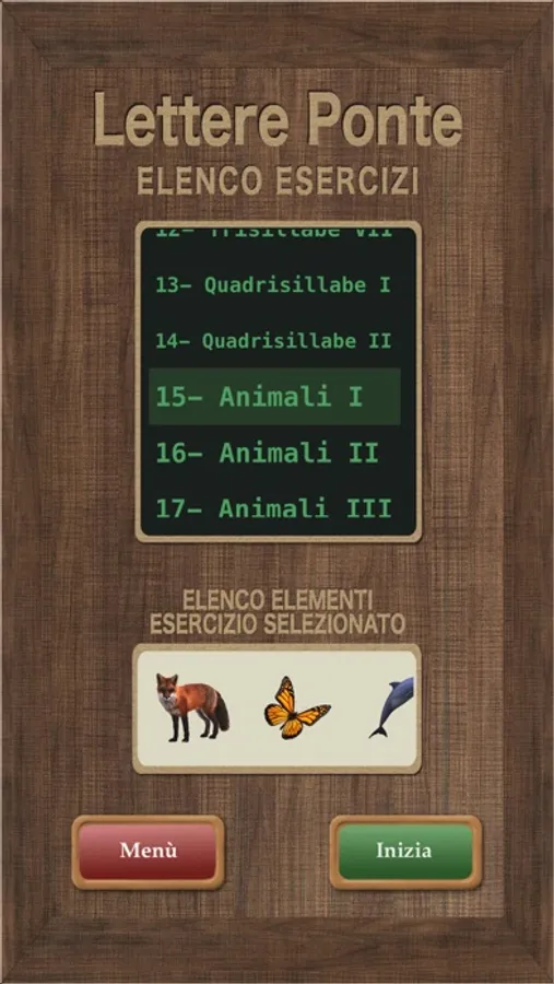 L’app propone semplici esercizi di ortografia in cui è richiesto il completamento di parole contenenti lettere ponte* e sillabe inverse*.
