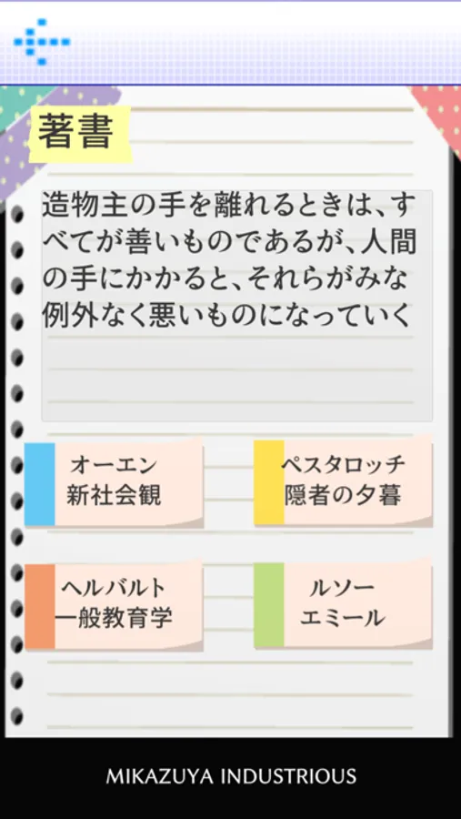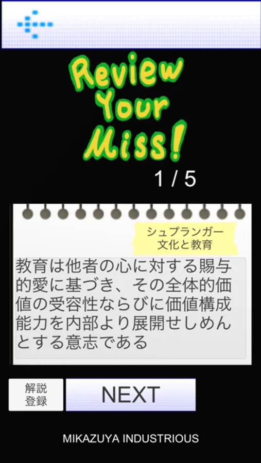 教員を目指す全ての人に向けた、教職教養の学習アプリです。2つのモードを搭載しています。著書編では、内容を元にその人物と著書名を、理論編では唱えた理論を元にその人物名を答えます。不正解すると学習指導要領解説の内容を交えた解説が表示されます。また、カレンダーによって日々の学習記録が自動で作成されます(午前・午後別)。さらに、設定によるリマインドが可能で、1日最大2回の通知を端末に送ることができます。