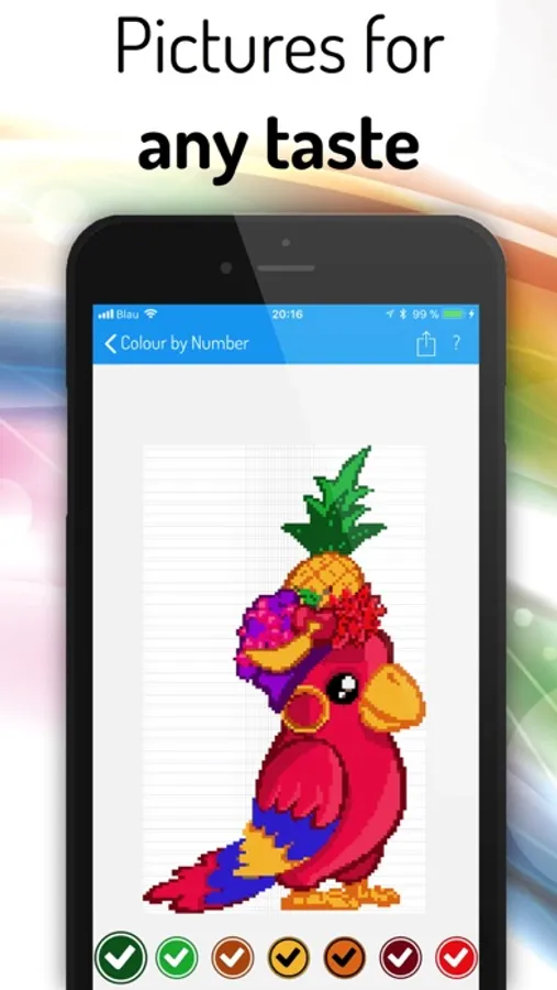 The colouring app gives you access to an insane amount of FREE pictures to colour. Create your own unique artworks!