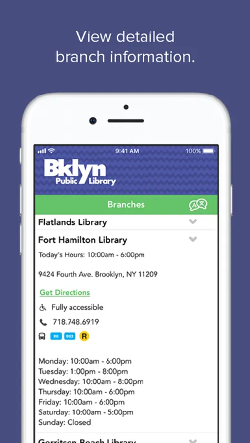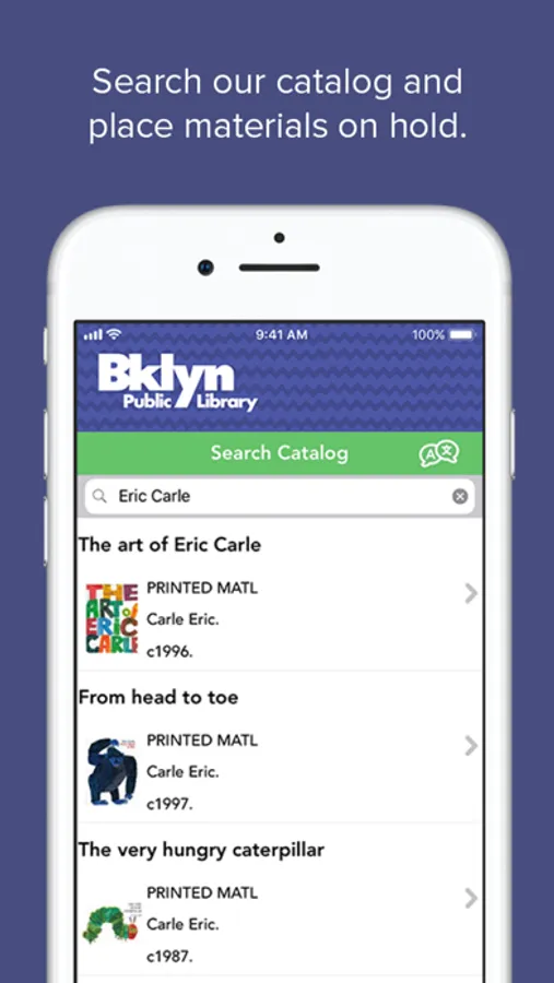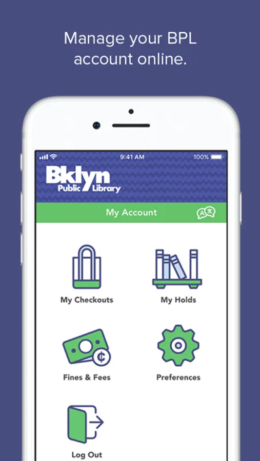 With the BPL app, you can access Brooklyn Public Library at any time! Search our catalog, place holds, pay fines or renew your materials, find your local branch and discover upcoming events and programs for all ages. You can also browse our eBook/eAudio collection and use the Library's digital resources. Check the online calendar to view events by location, date or topic, and find detailed information about our neighborhood libraries including hours and nearby public transportation. And if you’re at a BPL location, use your digital library card to check out materials at the desk or any self-check machine.