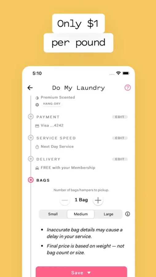 You can put your laundry out for pickup in any bag you want, disposable bags, or your hamper. Most people use disposable bags. If you use your hamper we'll transfer your clothes to our disposable bags and leave your hamper behind. You can also use laundry bags, which we'll return to you laundered.