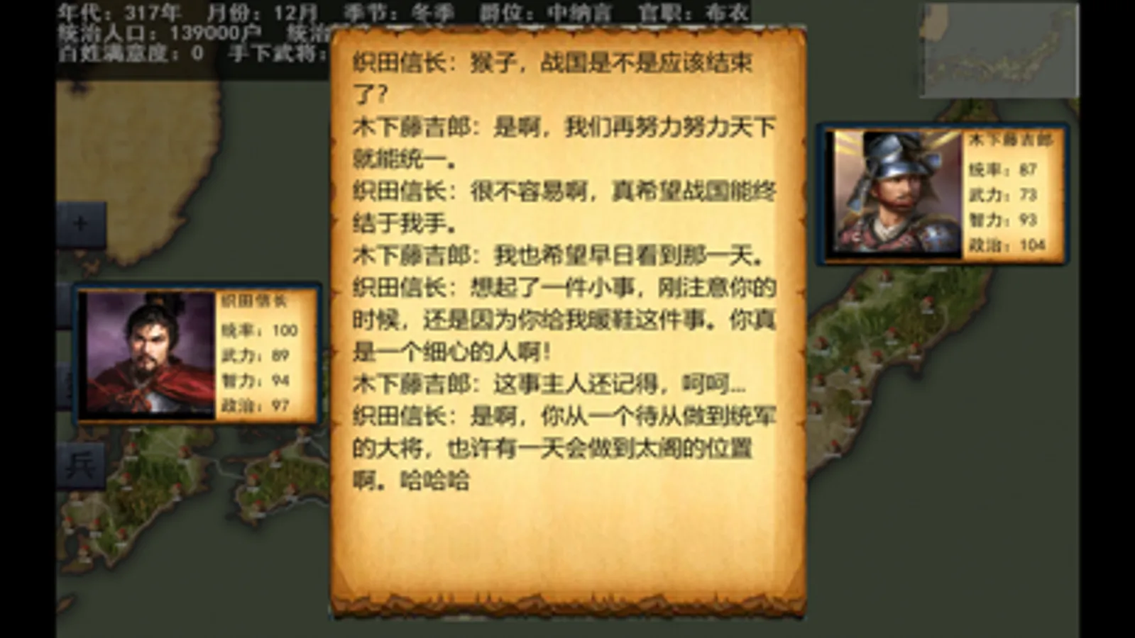 此游戏以模拟日本战国时代为背景,玩家扮演一方诸侯以统一日本为游戏目的的模拟游戏。