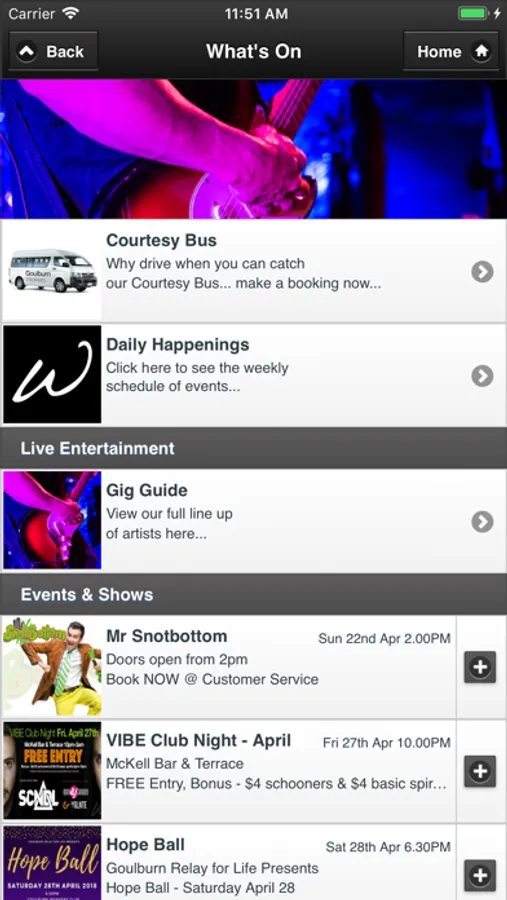 Day to day activities, Featured events, LIVE entertainment, Weekly performing artists, Dining menus, Daily specials and it notifies you on all special events. It provides you with all the venue’s information & news at your finger tips & more