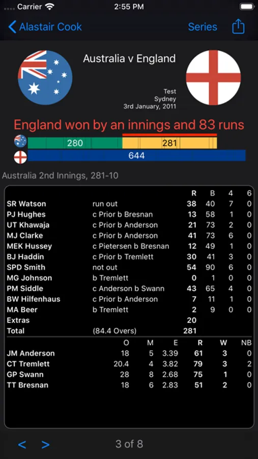 Lookup your favourite cricketer, see every international inning they have every played.